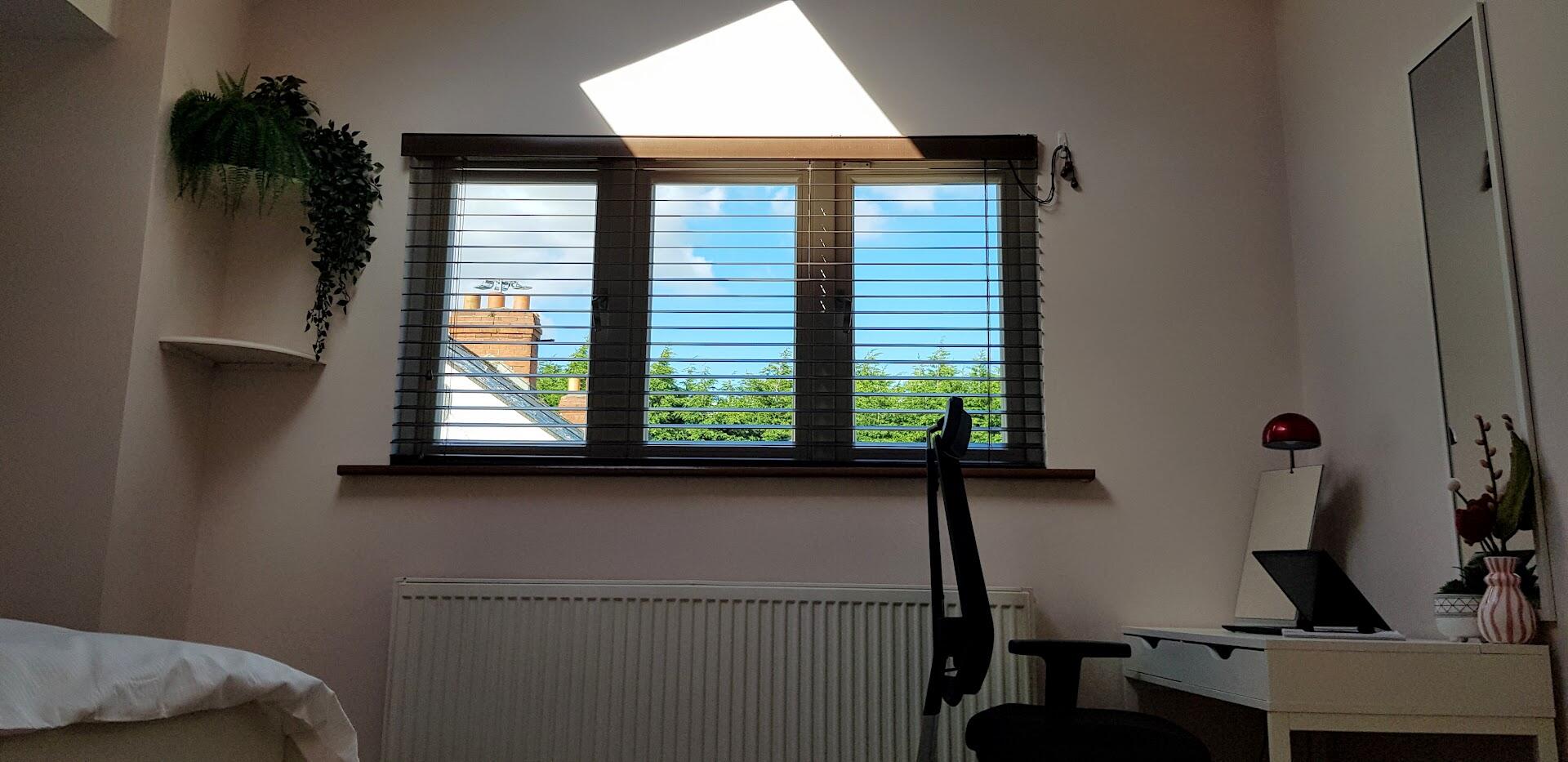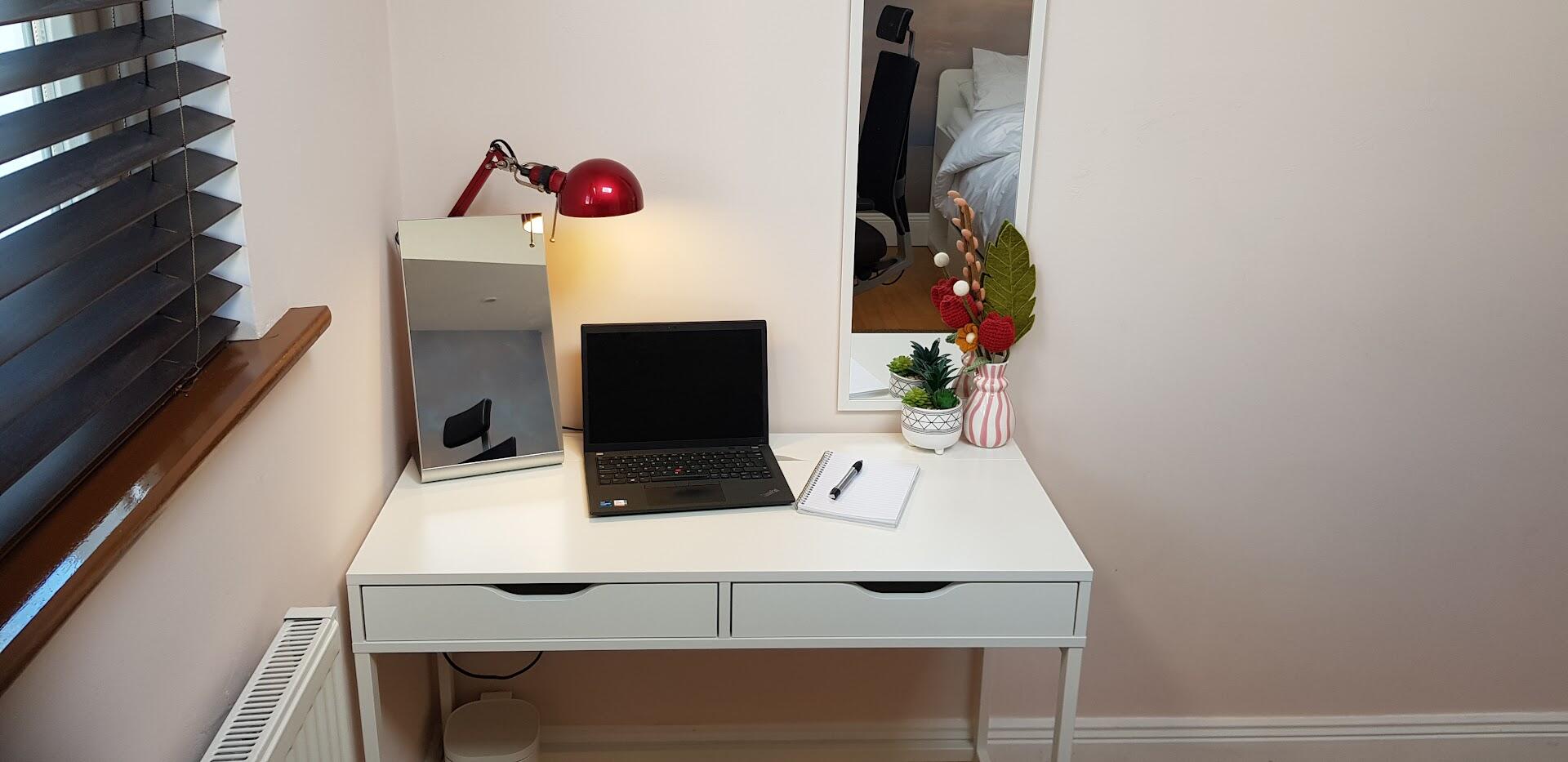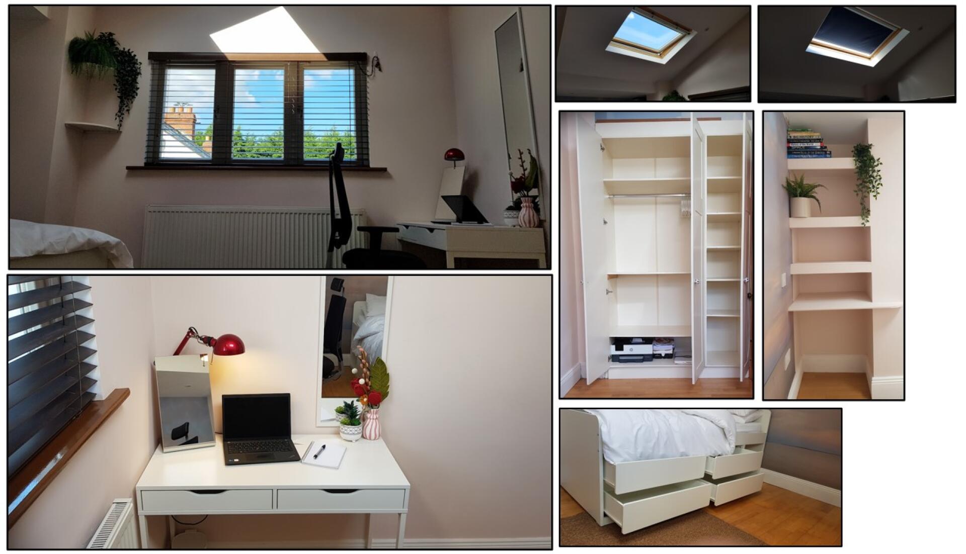 Bright single room with new study desk and chair. Brand new bed, mattress, anti allergy duvet and pillows. Built in wardrobe, under bed drawers, built in shelves, desk drawers. Small fridge provided. Access to open plan kitchen/dining area. Self service breakfast. Separate family sitting room. 8Km to TCD. 8Km to UCD.