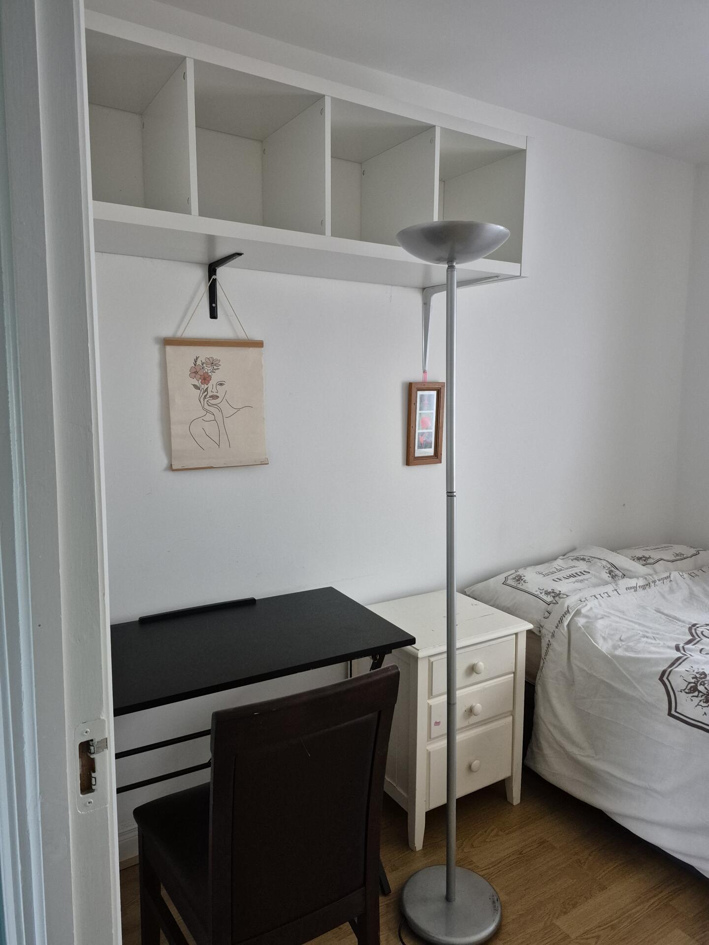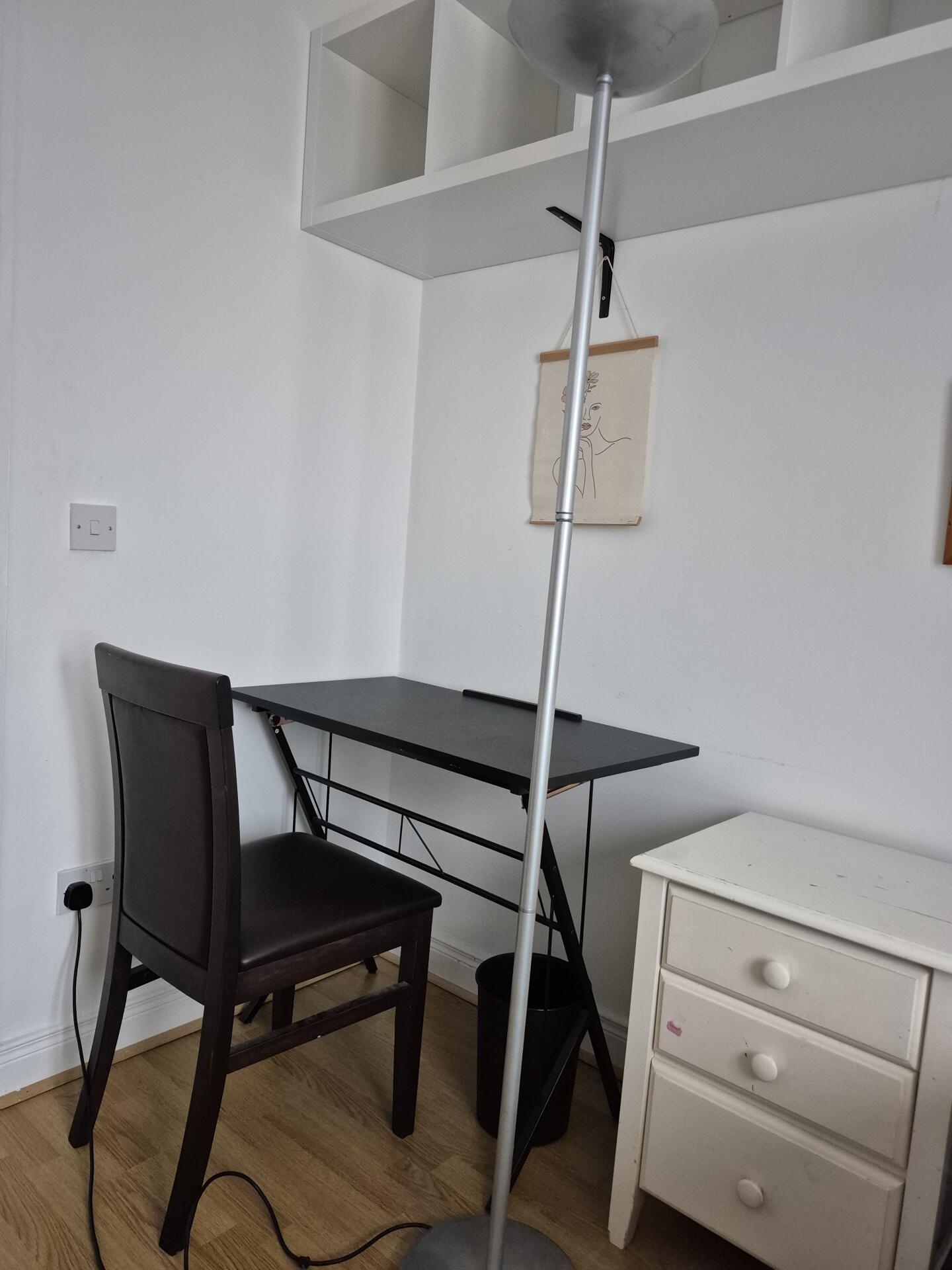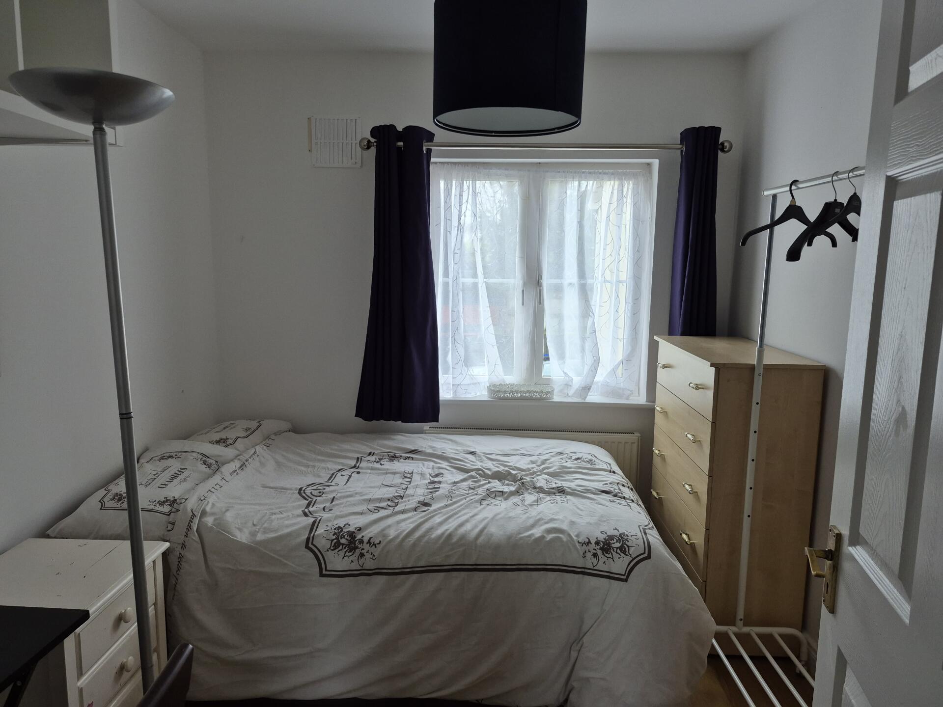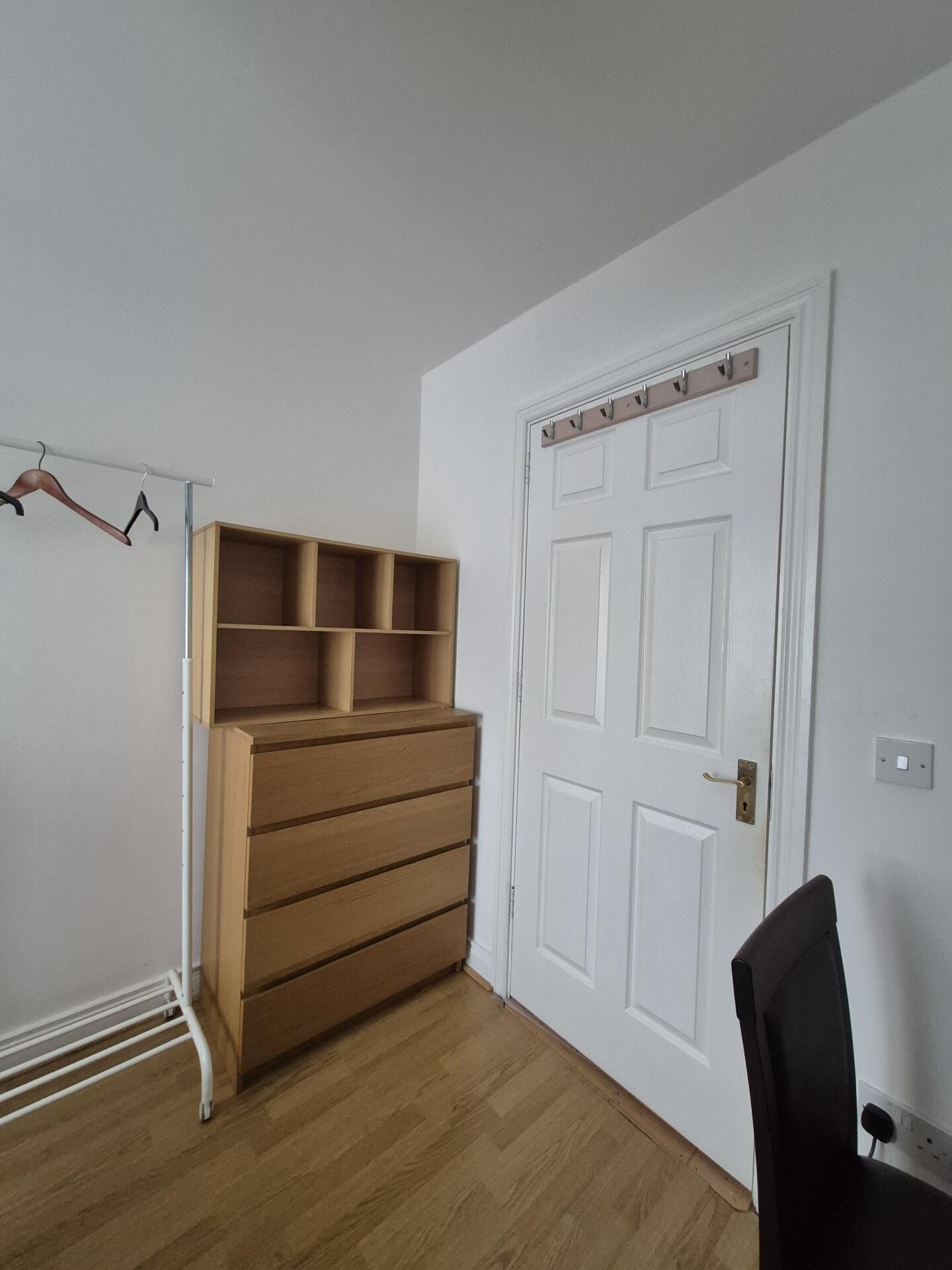 Modest double bedroom with small double bed dimensions. Clothes rail, shelving, 2 chest of drawers, a bedside locker, a desk with chair. 2 owner occupiers living in the house, main bathroom will be shared with one other person. WIFI available, bills included. Parking space available at an additional cost.