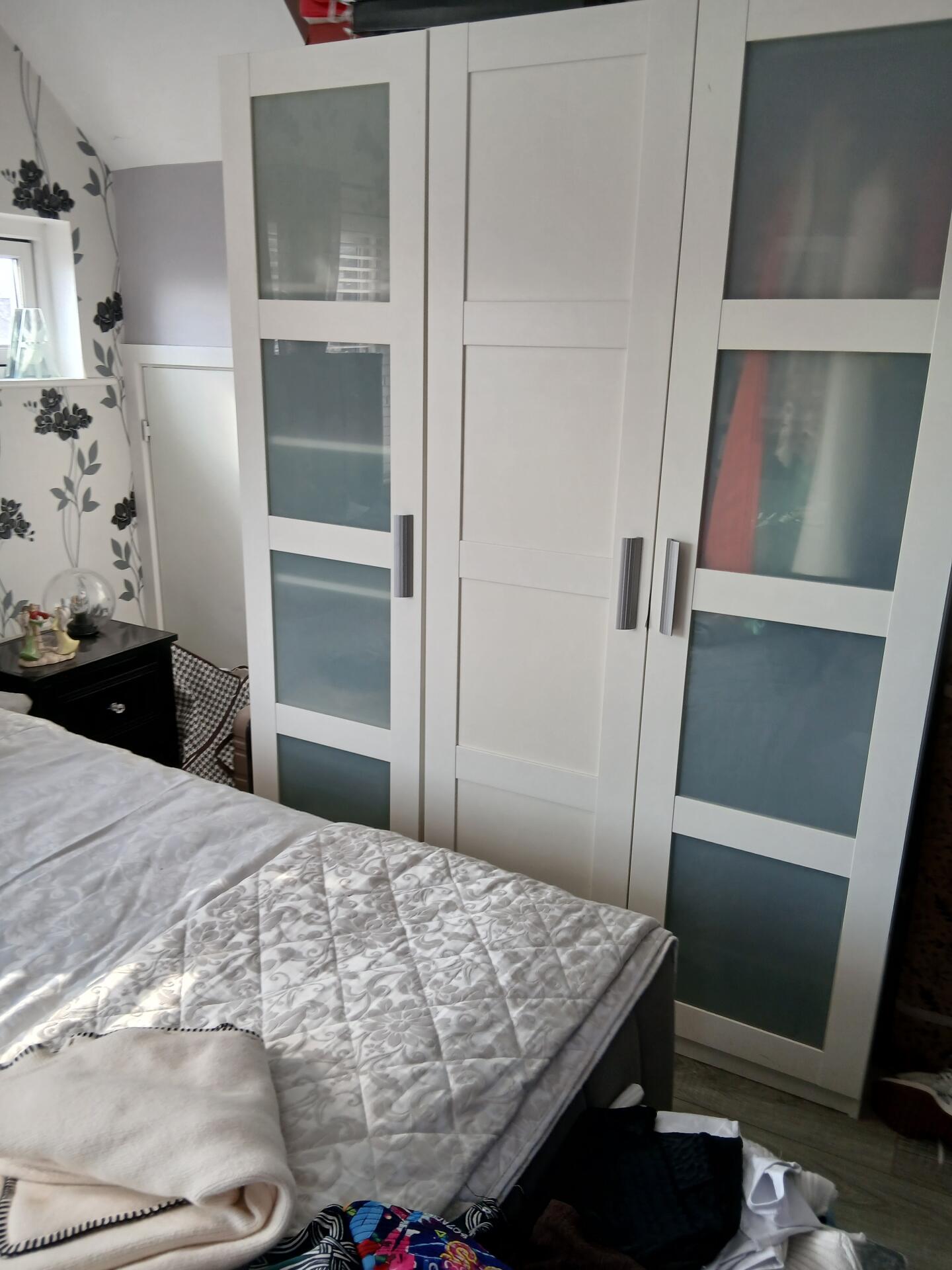 A bright and comfortable double room is available for rent in a well-maintained home. The room features a double bed and offers excellent storage space, including three wardrobes and two lockers, making it ideal for someone looking for both comfort and practicality.