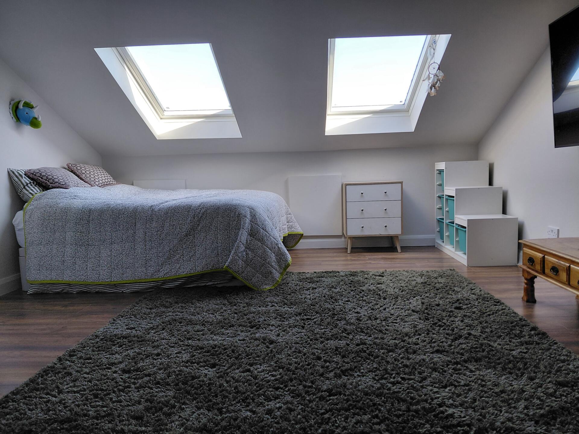 Available from start of May for 5 nights, Mon-Fri / Sun-Thurs : Bright, very large & spacious attic room with king size bed, chest of drawers, couch, very large TV with Netflix etc. Lovely sea view over the rooftops. Exclusive use of the main bathroom which has room for another storage unit if wanted. Can add study desk with office chair, mini-fridge, kettle etc if wanted.