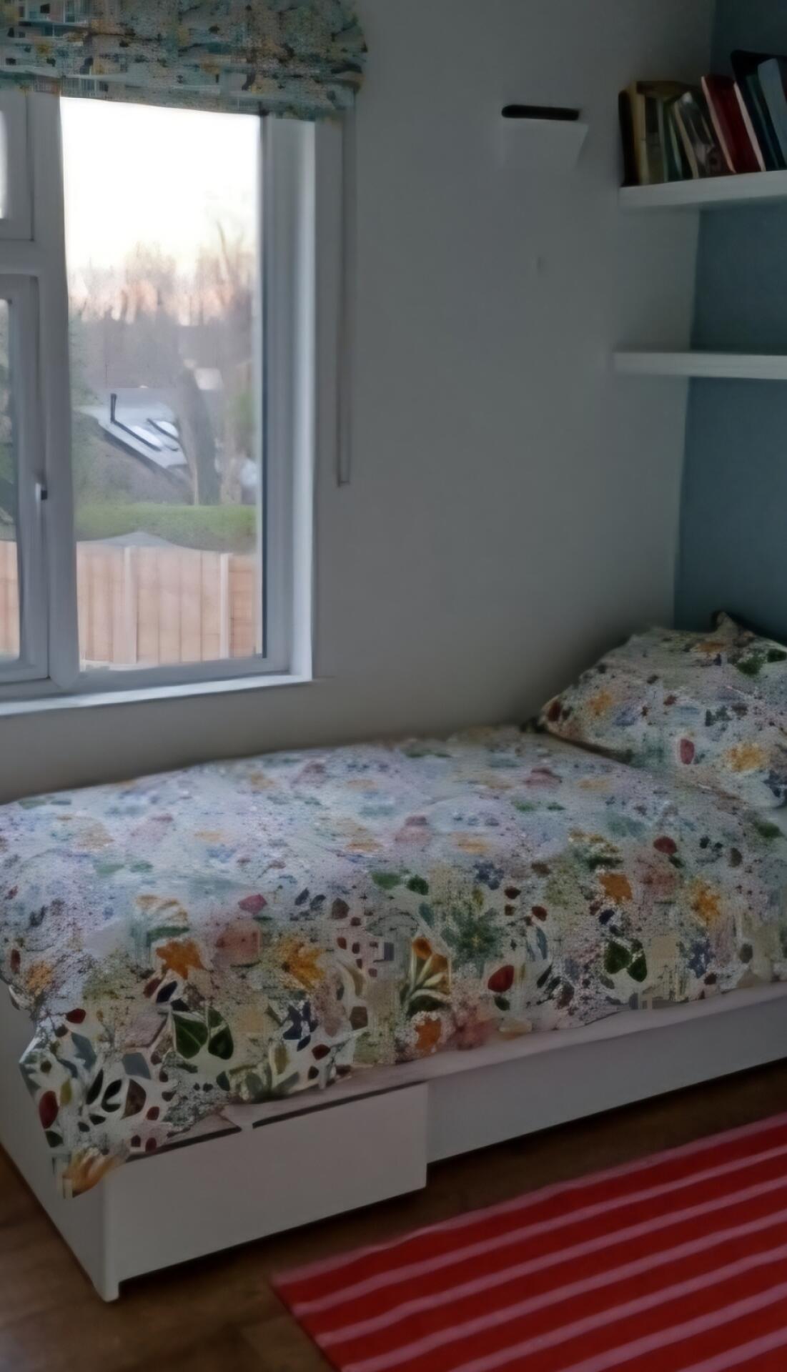 Small, bright, single room with underbed storage & large new wardrobe. Window with view of back garden. Shelves x 2.